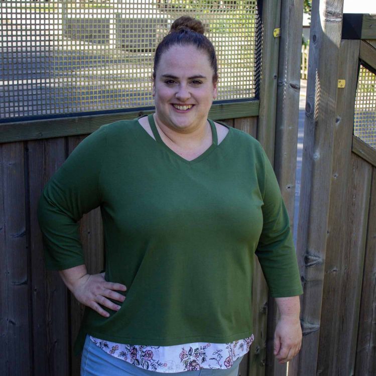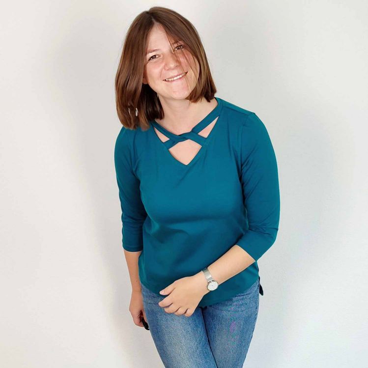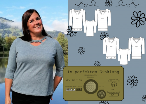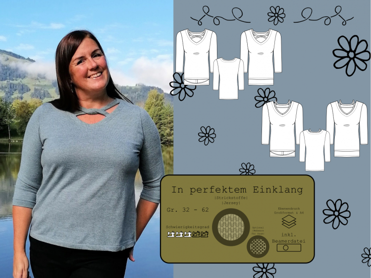 Zusammengefasst: Dieser Schnitt bietet dir einen Pullover mit V-Ausschnitt mit 2 Abschlussmöglichkeiten, 3/4-Ärmel und einen optionalen Fake Blusensaum, das Rückenteil des Pullovers ist etwas länger geschnitten.