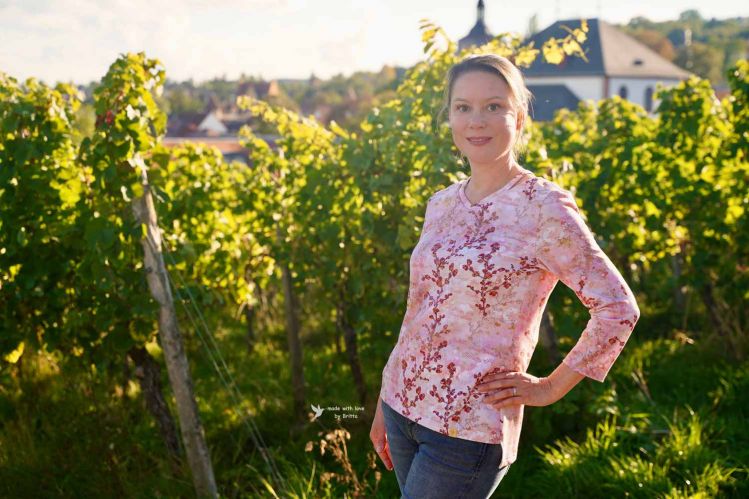 • Als Material eignen sich dünne bis mittelschwere Strickstoffe, Jersey etc. und ein Stück Viskosewebare, Baumwollpopeline etc. für den Blusensaum