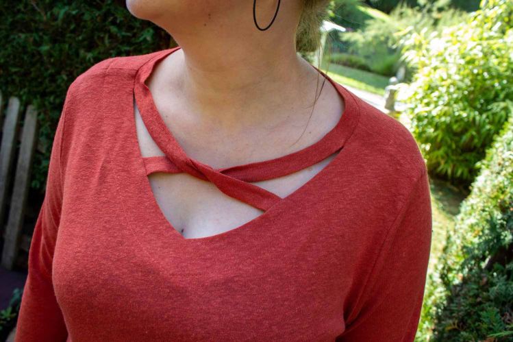 Ich musste bei dem Ausschnitt des Pullovers an Yin & Yang denken, zwei Gegensätze, die sich ergänzen. Der Abschluss trennt sich zunächst, um sich gleich darauf wieder zu verbinden, in perfektem Einklang. Zwei Möglichkeiten von Halsausschnitten, 3/4-Ärmel und ein Fake Blusensaum runden das Design ab.