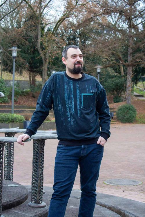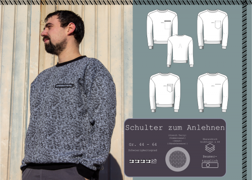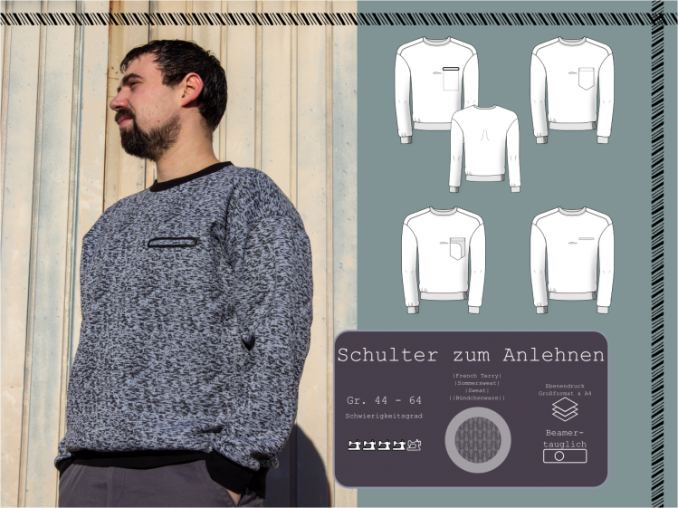 Wie froh sind wir doch, wenn wir jemanden haben der uns auffängt, uns den Rücken stärkt oder einfach nur mit einer starken Schulter bereit steht. Da ist dieser Herrensweater mit seiner ausgefallenen Schulterpartie doch genau das Richtige. Schulter zum Anlehnen kommt lässig und bequem daher und überzeugt durch das schlichte, auf den Punkt gebrachte Design. Aufgrund der verschiedenen Taschen, die das Schnittmuster zu bieten hat, und den Kombinationsmöglichkeiten, kannst du dennoch viele individuelle Sweater daraus zaubern.