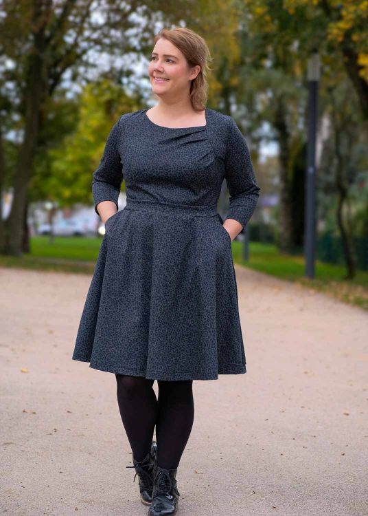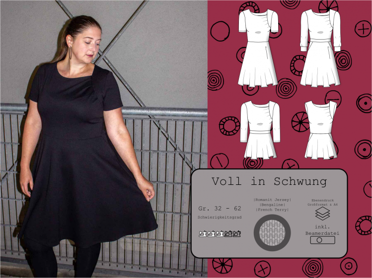 Und hier ist es nun, auf vielfachen Wunsch, das Kleid Schnittmuster Pendant zum Jumpsuit „Fügung des Schicksals“. Dieser Schnitt beinhaltet das Oberteil, dessen Brustabnäher nun in Falten gelegt in einer seitlichen Passe enden. Es verfügt ebenso über verschiedene Ärmellängen und auch eine ärmellose Variante. Dazu einen Glockenrock mit integrierter Shirtlänge und optionalen Taschen. Aber auch hier gibt es einen zweiten Tellerrock mit Falten, den man separat erwerben und annähen kann. Beide Röcke als schön weit, für einen tollen Schwung.