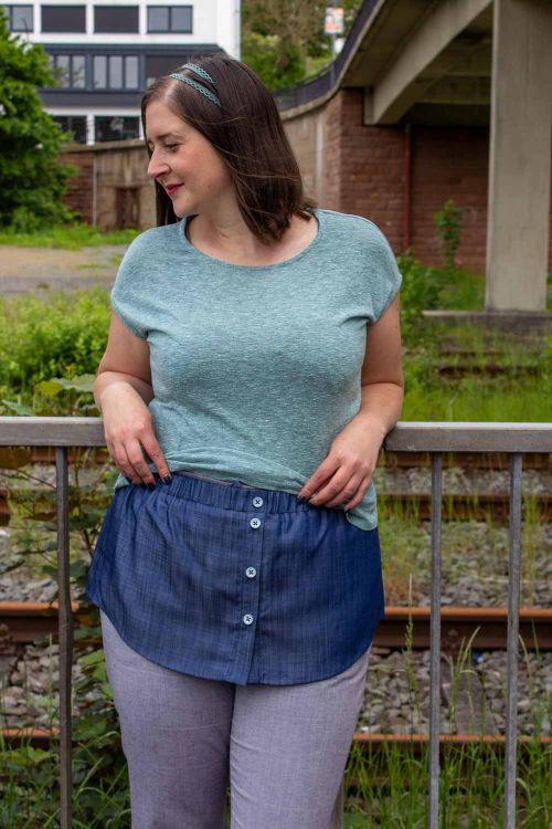 Zusammengefasst: Dieser Schnitt bietet dir einen Fake-Blusensaum, einen kurzen Rock und einen wadenlangen Rock. Mit optionalen Taschen, Gürtelschlaufen, Seitenschlitzen und einem bequemen Gummibund.