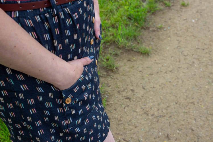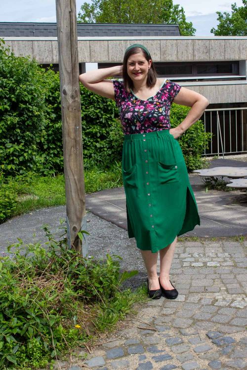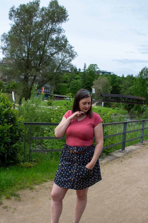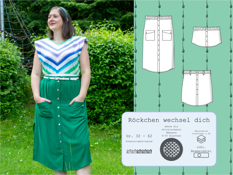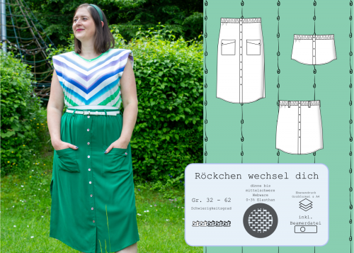 Angelegt an mein Kleid „Kleidchen wechsel dich“ kam mir die Idee einer Rockvariante. Diese ist aber tatsächlich nur angelehnt, denn die Rockweite ist deutlich weiter als das Kleid. Zudem verfügt der Rock über einen Gummibund und Gürtelschlaufen, sowie aufgesetzte Taschen mit asymetrischem Umschlag. Der Schnitt beinhaltet 3 Längen für eine Fakebluse, eine Länge, die über Knie und eine Länge, die Mitte der Wade endet.
