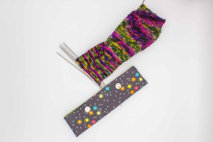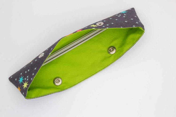 Somit passt ein 20cm Nadelspiel perfekt hinein, aber auch ein 15cm Nadelspiel kann darin verstaut werden, da die Druckknöpfe so positioniert sind, dass das Nadelspiel nicht herausrutschen kann.
