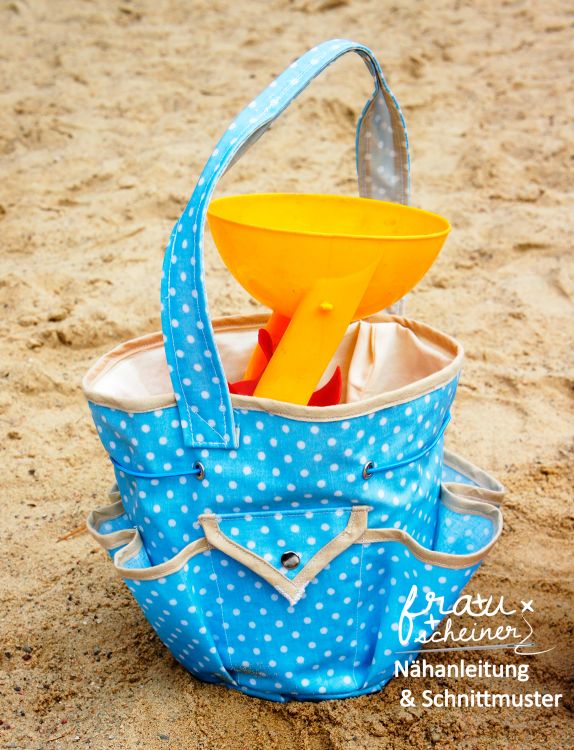 Der große kegelförmige Korpus für die Standardgröße eines Sandspielzeug-Eimers schließt mit einem Taschenverschluß aus Baumwolle ab. Ein bequemer Henkel für über die Schulter hängen oder in der Hand tragen.