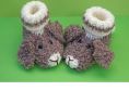 Die Schuhe werden mit kuschlig warmer Fransenwolle gestrickt ( z.B. Teddy Aran von Rico, oder Bombom von Katia ) wodurch der tolle Effekt des Kuschelfells entsteht. Es lässt sich aber jede andere ( Fransen- ) Wolle dafür verändern. Die Schuhe werden angenehm warm und weich und sind sehr dehnbar so dass sie lange getragen werden können.