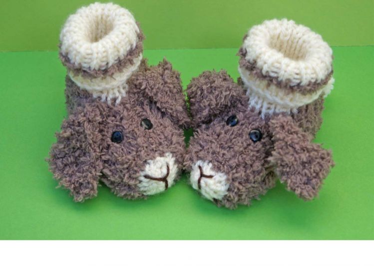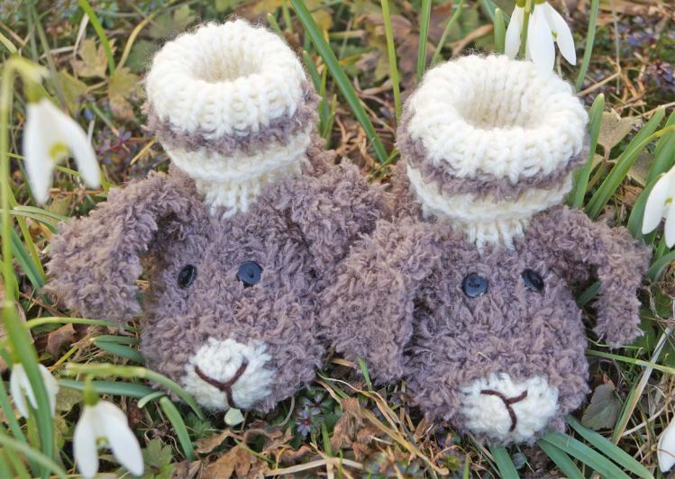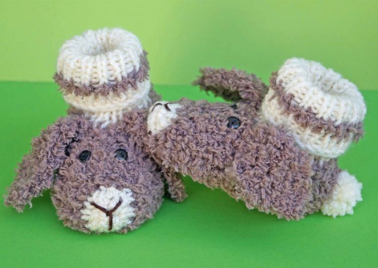 Strickanleitung für kuschlige Baby- Schuhe in der Form eines kleinen Häschens mit Hängohren - nicht nur zu Ostern ein süßer Blickfang an Babys Füsschen.