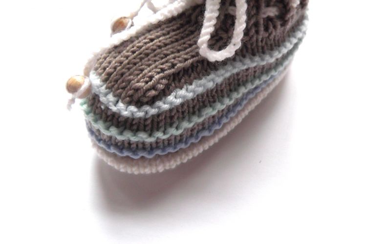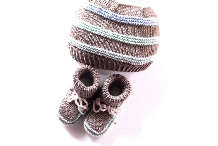 Babymütze mit passenden Schühchen für Neugeborene (Gr. 50/56). Die Mütze wird in Runden mehrfarbig gestrickt, nur mit rechten und linken Maschen - perfekt für Anfänger. Die Schühchen sind etwas komplizierter - aber mit ein wenig Übung schaffst du das auch.