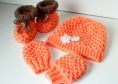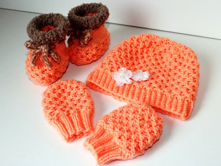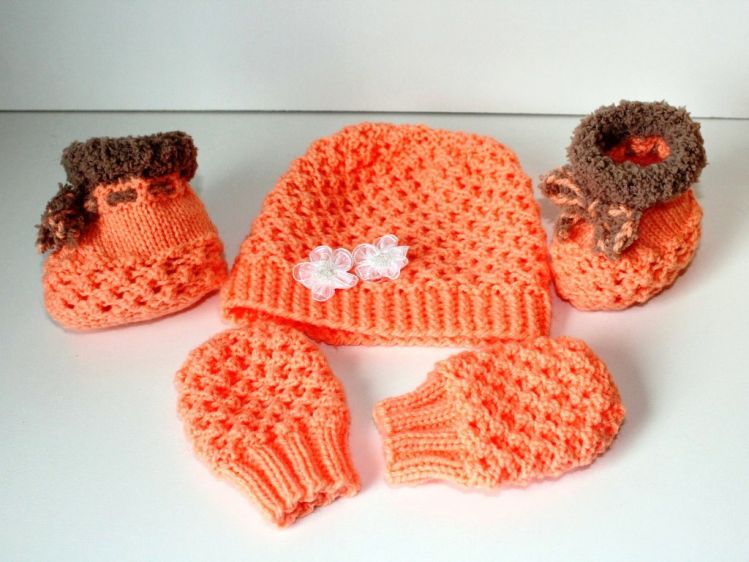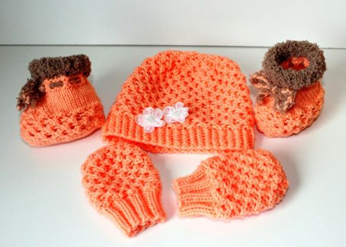 Bestehend aus Mützchen, Babyschuhen und Handschuhen.