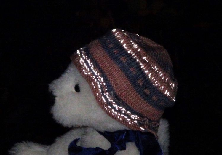 Das besondere an der Mütze ist, das ich einen Leuchtfaden von Prym streifenweise mitgestrickt habe und die Mütze somit leuchtet wenn sie im Dunkeln angestrahlt wird, sie ist also quasi eine Sicherheitsmütze.