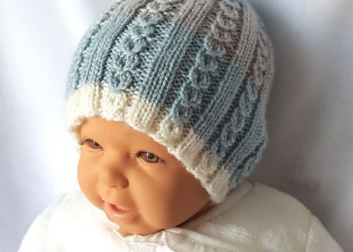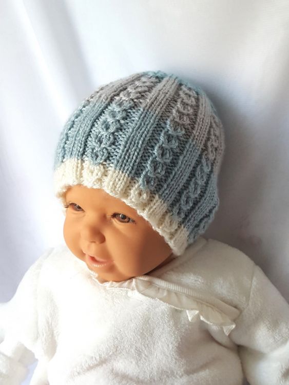 Absolut anfängertauglich ist diese Babymütze, da für das Muster keine weitere Hilfsnadel benötigt wird.