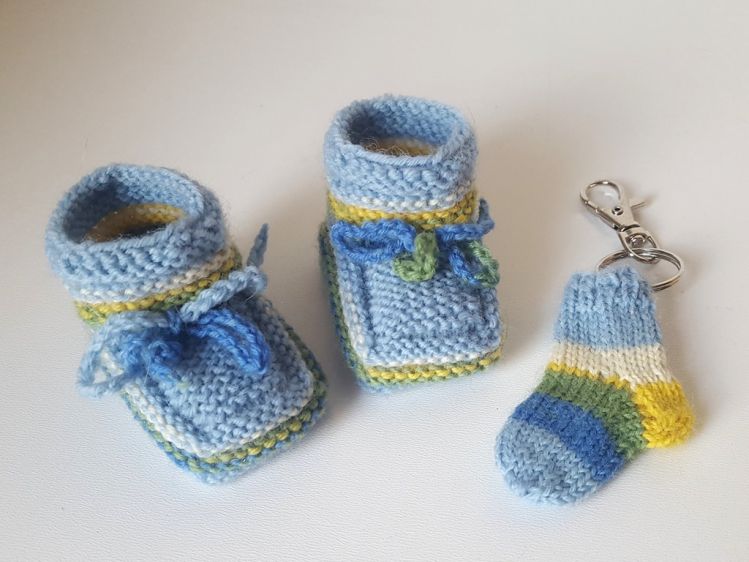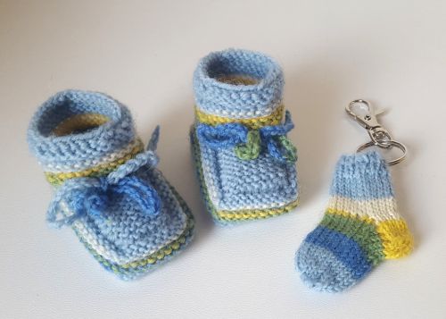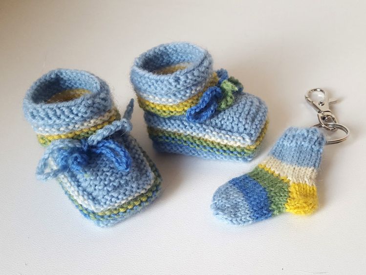 Strickanleitung Baby-Booties + Schlüsselanhänger Ideal zur Resteverwertung sind diese Baby-Erstlings-Schuhe geeignet. Es werden hierfür lediglich ca. 15 - 18 g 4-fach-Sockenwolle benötigt. Die Schühchen haben eine Sohlenlänge von ca. 7 - 8 cm und sind passend von ca. 0 - 3 Monaten. Da beim Sockenstricken immer Wollreste übrig bleiben, gibt es zusätzlich noch die Anleitung für die Mini-Socke dazu. Hier passt genau ein Einkaufswagen-Chip hinein und kann als Taschenbaumler oder Schlüsselanhänger verwendet werden.