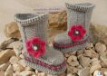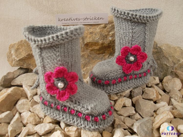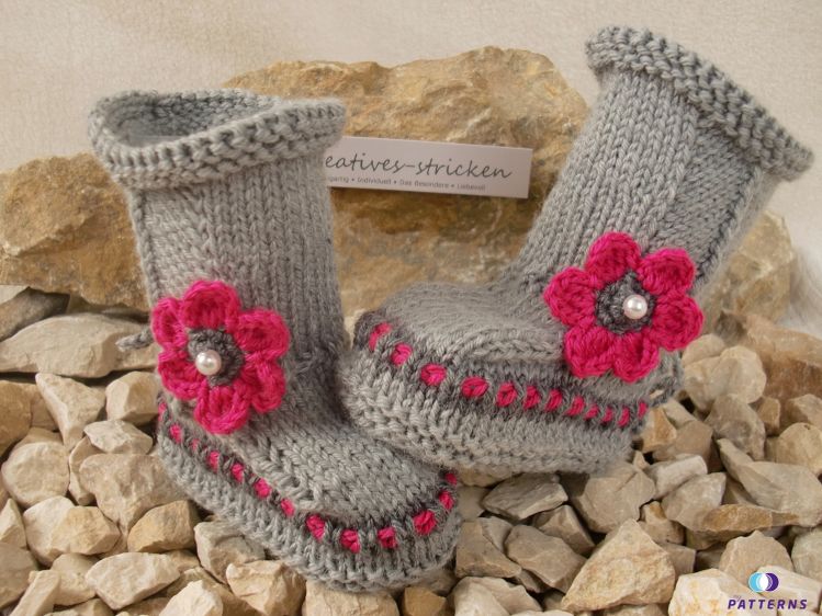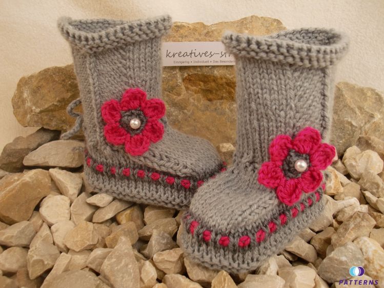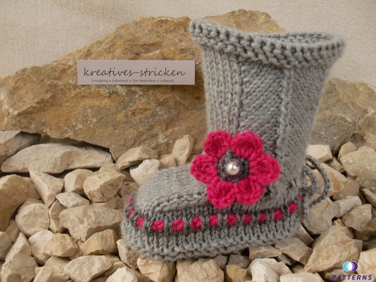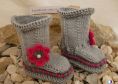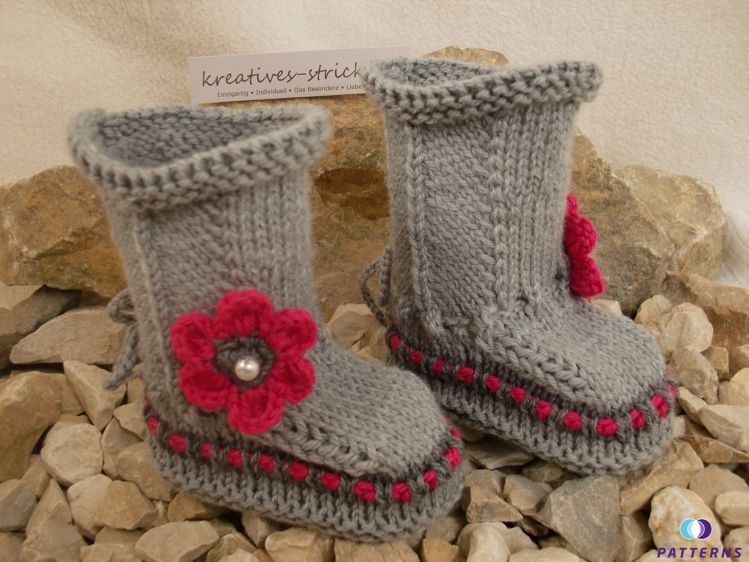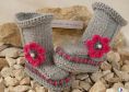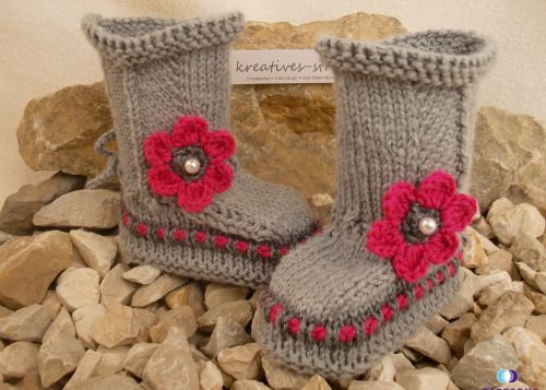 Diese Babybooties sind so gestrickt, dass sie sowohl edel aussehen, aber auch bequem zu tragen sind. Sie passen super über den Strampler, aber auch eine Jeans oder ein Rock dazu sieht total schön aus. Gegen das Abstrampeln hilft ein Bindeband, mit dem die Stiefel den Füßchen angepasst werden können. So bleiben die Schühchen da, wo sie sein sollen und sind alltagstauglich. Damit hat Baby keine kalten Füßchen mehr.