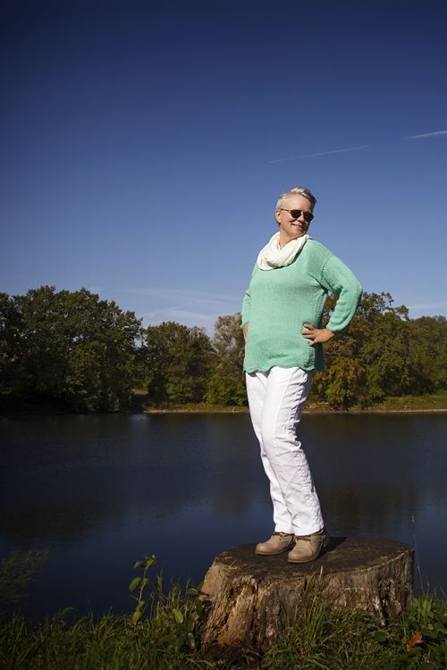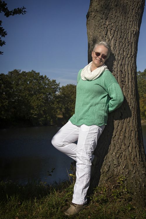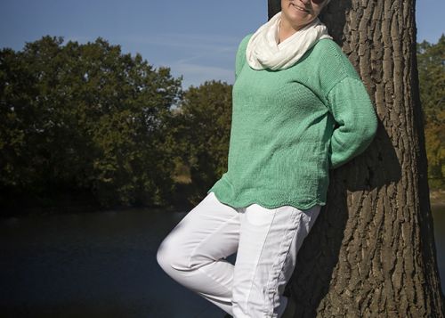 Der Berg &Tal-Sweater ist ein Pulli, der glatt rechts gestrickt wird. Der Hingucker ist der untere Rand des Pullis: Er hat kein Bündchen, sondern einen wellenförmigen Abschluss. Damit ist dieser Pulli eine Mischung aus Tunika und Sweater. Der in den Fotos gezeigte Pullover wurde aus einem dünnen Baumwollgarn gestrickt. Sie können für den Pullover aber auch jedes andere Garn mit einer ähnlichen Lauflänge verwenden.