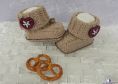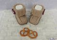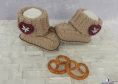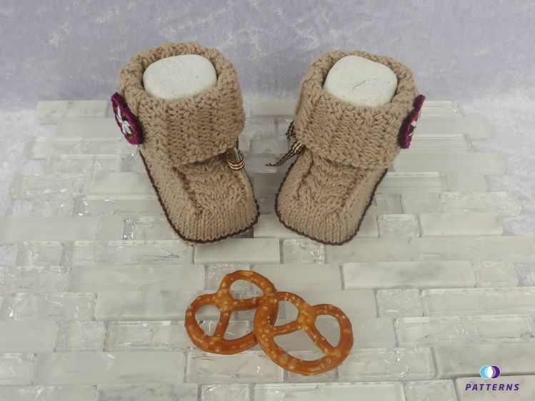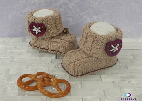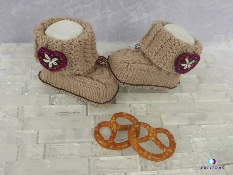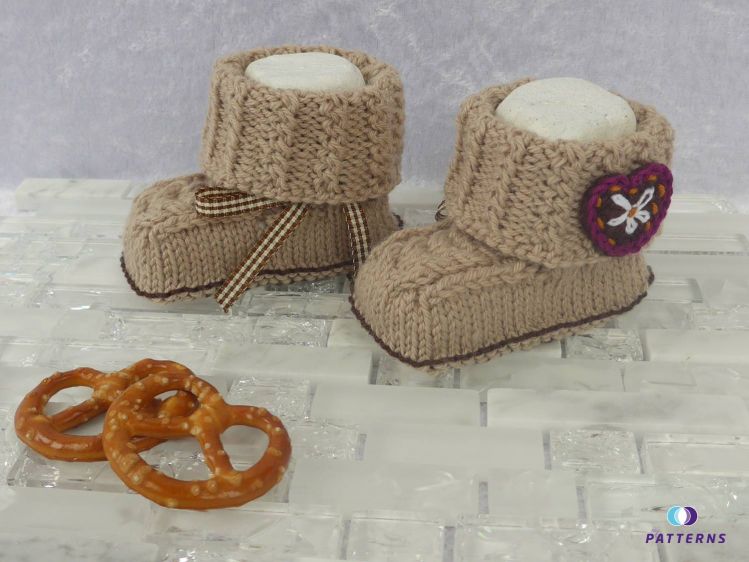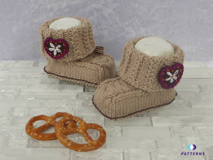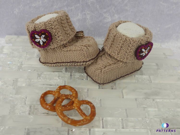 Diese Trachtenschühchen sind garantiert ein Blickfang an Baby's Füßchen. Sie sind mit einem schönen Zopfmuster versehen und am Bündchen ziert sie ein gehäkeltes Lebkuchenherz. Anstelle des Herzchens könnte man auch einen Knopf zur Zierde annähen. Damit sie nicht so leicht abgestrampelt werden können, wird ein Band zum Binden angebracht.