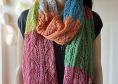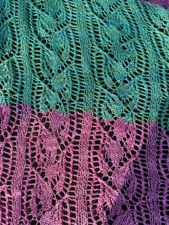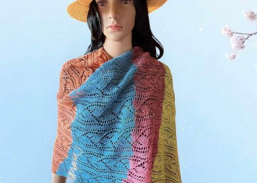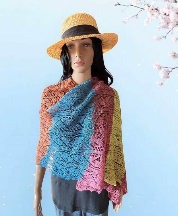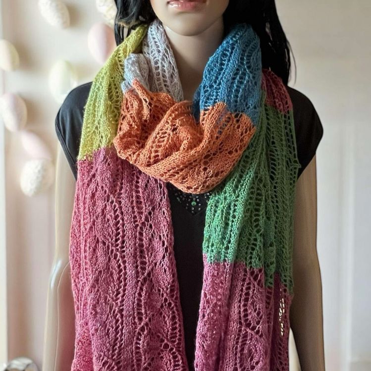 Der Sommerschal Gesa ist ein leichter Laceschal aus 200g Lace (800m LL/100g) und ist hier in der Buntversion mit 5x20g und 1x 100g Lace gestrickt. Er kann natürlich auch einfarbig gestrickt werden. Das Muster ist zeilenweise ausgeschrieben und auch als Chart dargestellt.