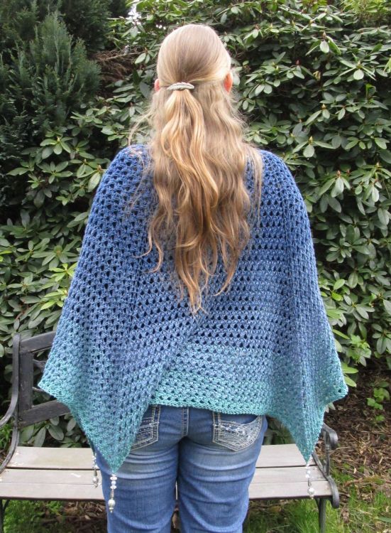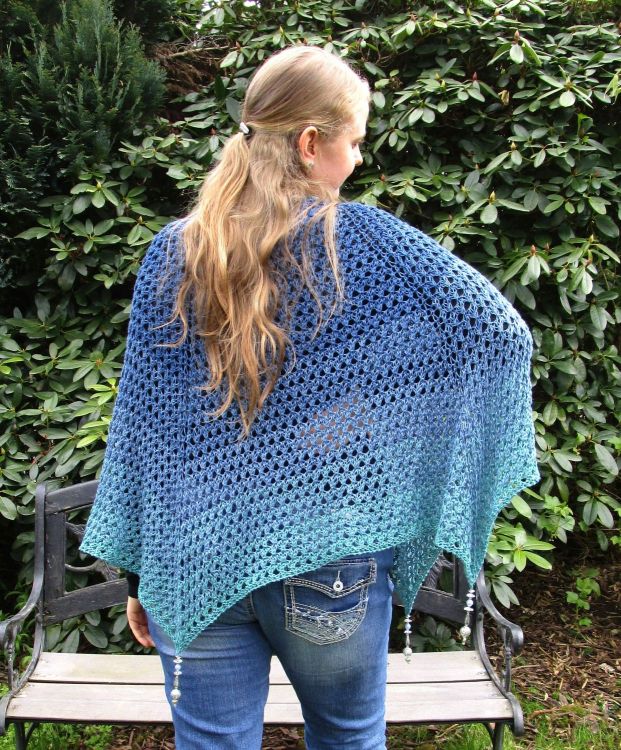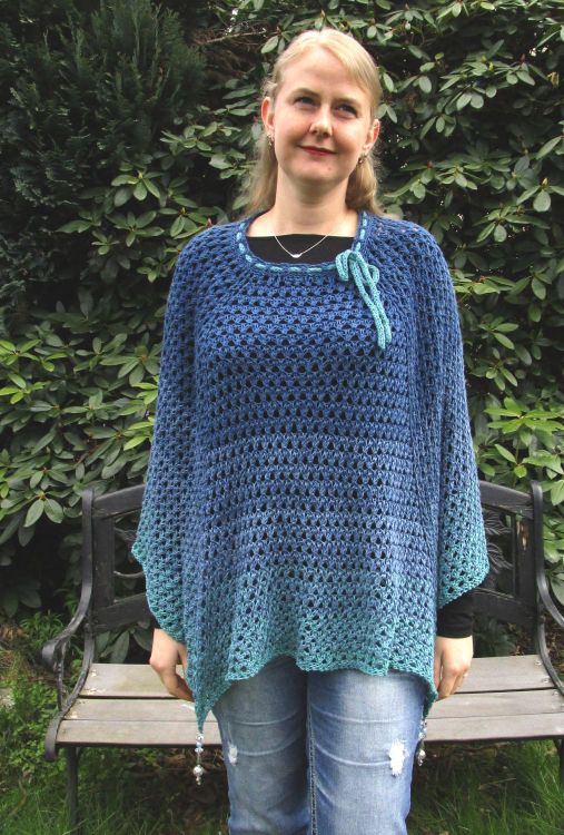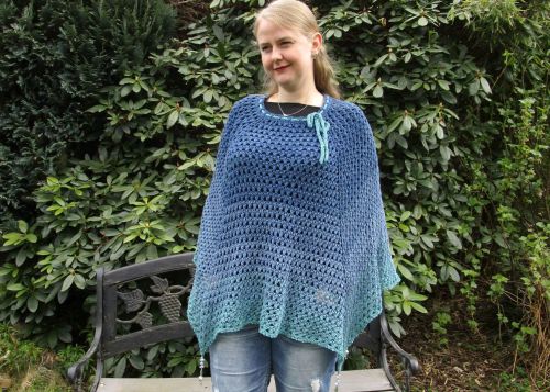Der Poncho wird mit dicken Nadeln gestrickt, damit er schön luftig wird. Das Lochmuster sieht von beiden Seiten eindrucksvoll aus.