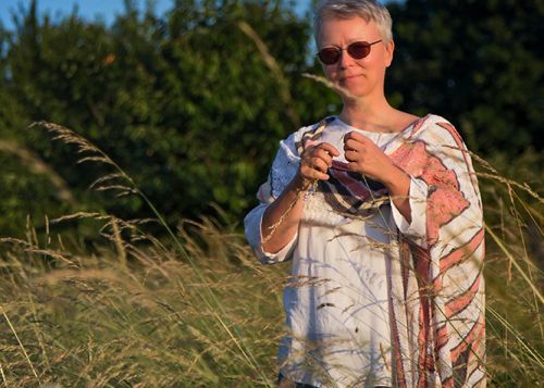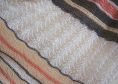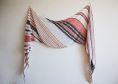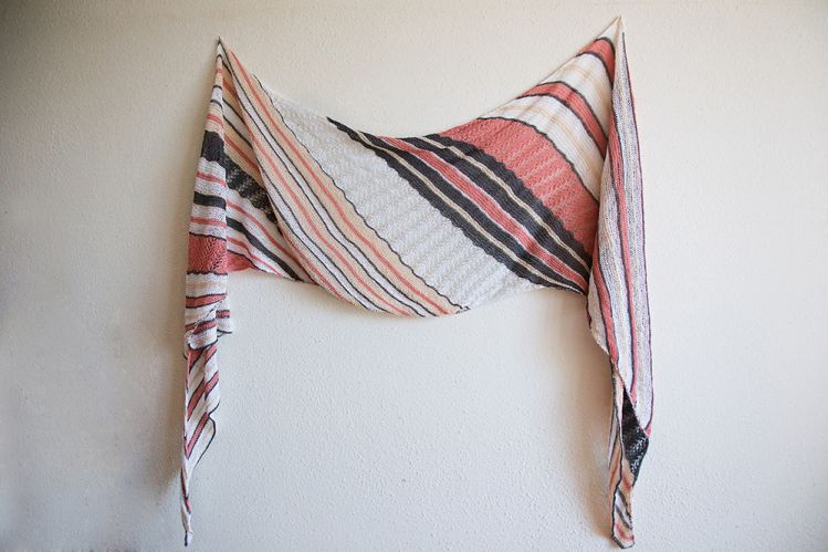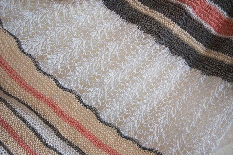 Das „Champagnerperlen“-Tuch besteht aus Blöcken mit einem Ajour-Muster und aus Blöcken mit farbigen Streifen. Das Streifenmuster wird durch Streifen des Champagner-Musters unterbrochen – wobei sich die Farbanordnung in den Streifen nach jeder Unterbrechung ändert. Durch die Abwechslung zwischen Streifen und Muster und die sich ändernde Farbwirkung der einzelnen Blöcke entsteht ein fröhliches Sommertuch – und das Stricken wird nicht langweilig! Sowohl die Farbstreifen als auch die Streifen des Ajour-Muster verlaufen nicht parallel zu den Seiten des Tuches, sondern bilden einen 45ᴼ zu seinen Seiten. Das Tuch hat keine geraden Enden. Die Farbstreifen laufen in Zipfeln aus, wodurch das Tuch länger wirkt, als es tatsächlich ist. Die Zipfel sorgen dafür, dass – egal wie es drapiert wird – das Tuch locker fällt und richtig schön lässig wirkt.