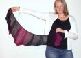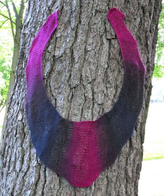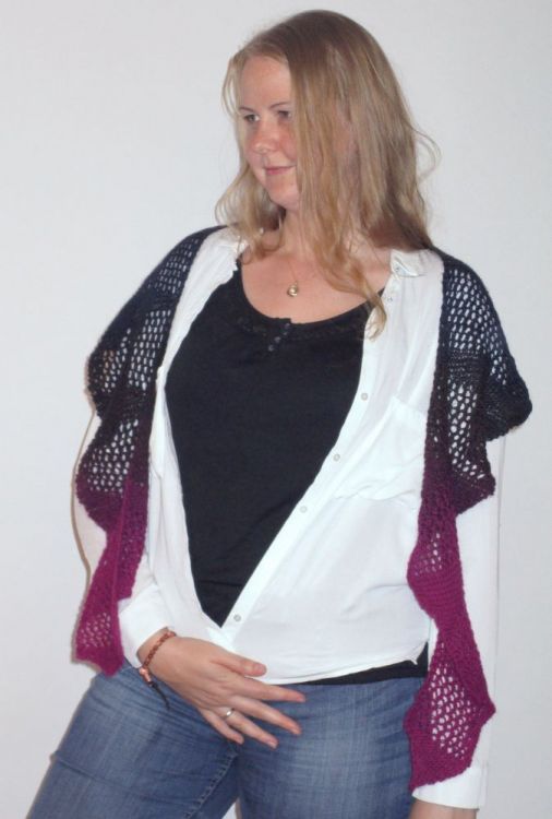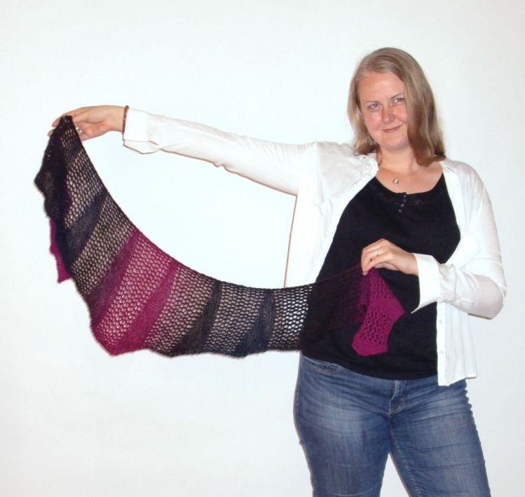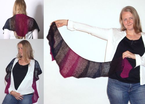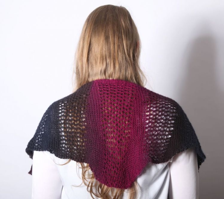 Lochmuster kombiniert mit Keilen aus verkürzten Reihen bilden eine schöne Tuchform, die sich wunderbar um die Schultern schmiegt. Und mit einem schönen Farbverlaufsgarn sieht das Tuch dann noch interessanter aus.