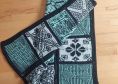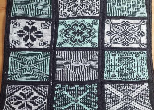 Diese Decke besteht aus 12 einzelnen Patches, Vierecken mit unterschiedlichen Mustern. Die Muster werden zweifarbig gearbeitet und man muss lediglich linke und rechte Maschen beherrschen. Die Zusammensetzung ist absolut nach dem eigenen Geschmack möglich und auch die Größe der entstehenden Decke ist frei wählbar, in dem man entscheidet, ob und wie viele Patches wiederholt werden sollen.