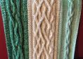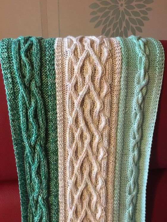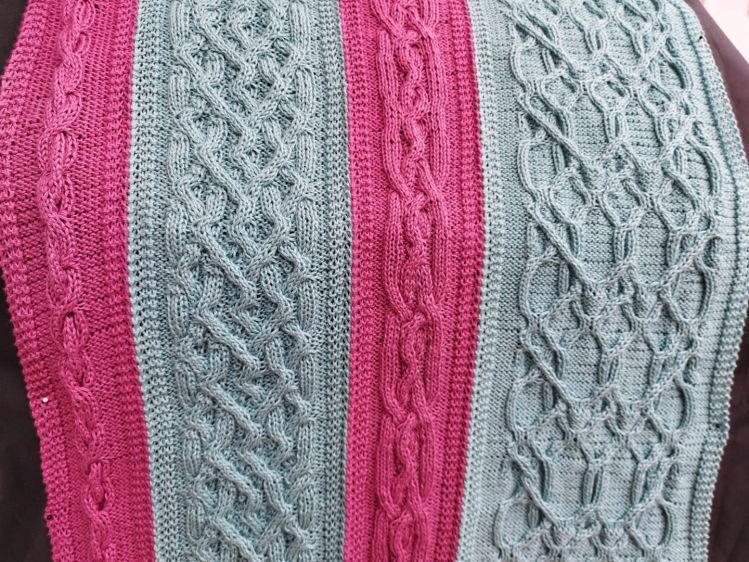 Die Decke besteht komplett aus keltischen Zopfmustern und wird in Bahnen gestrickt, die am Ende zusammen genäht werden.