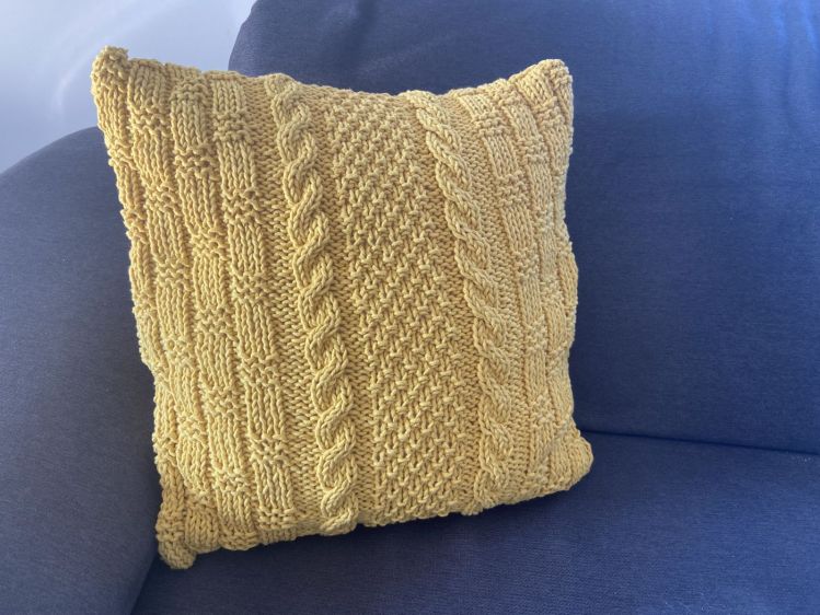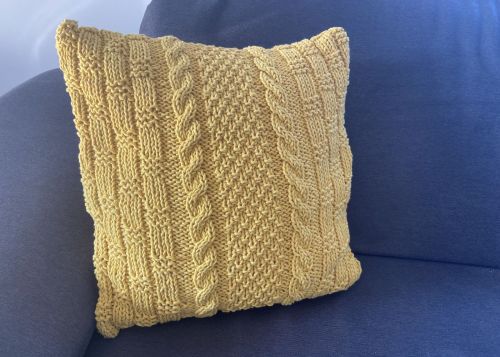 Die Kissenhülle „Stockholm“ mit ihren zwei Zöpfen und zwei verschiedenen Rechts-Links-Mustern, bietet Abwechslung schon beim Stricken.