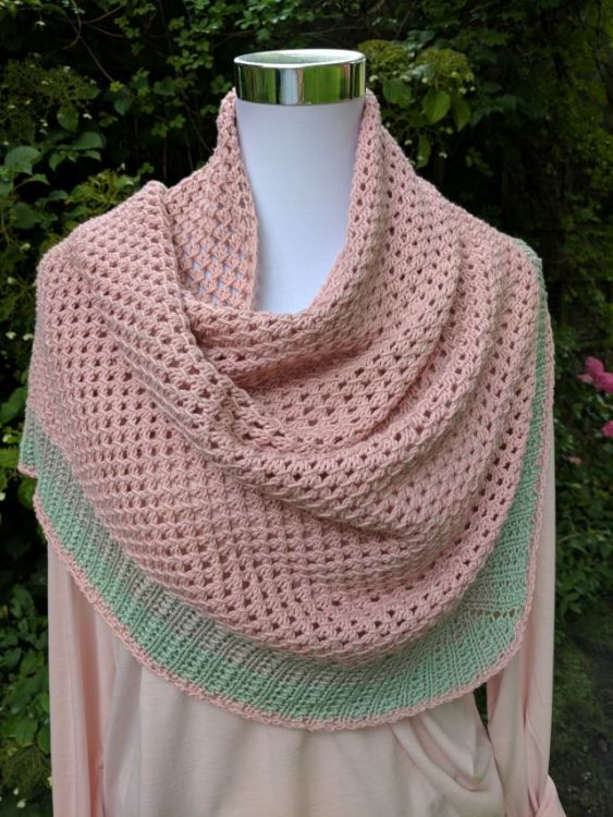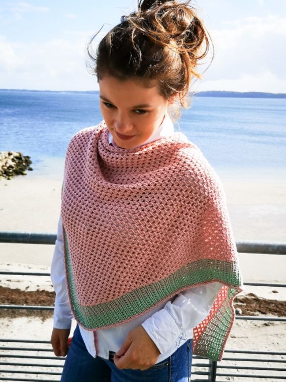 Gestrickt wird es mit LAMANA Cosma (60% Baumwolle/40% Modal) Ll 100m/50g. Es werden 350g benötigt. (250g Hauptfarbe und 2x 50g für den Rand)