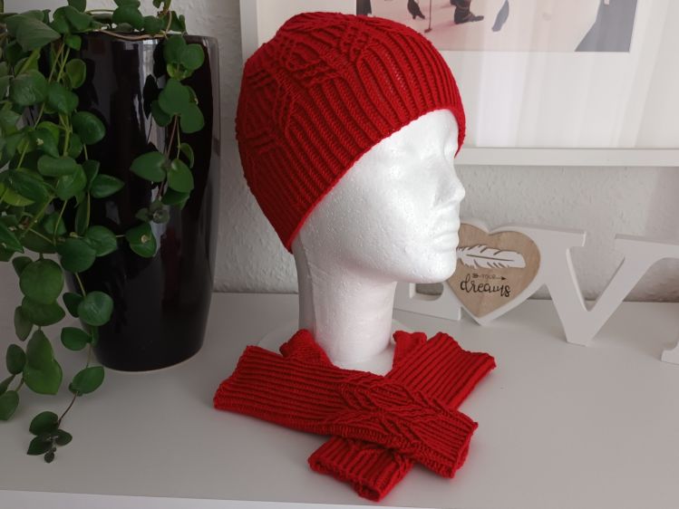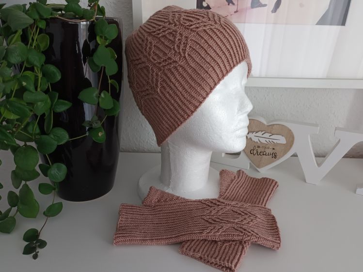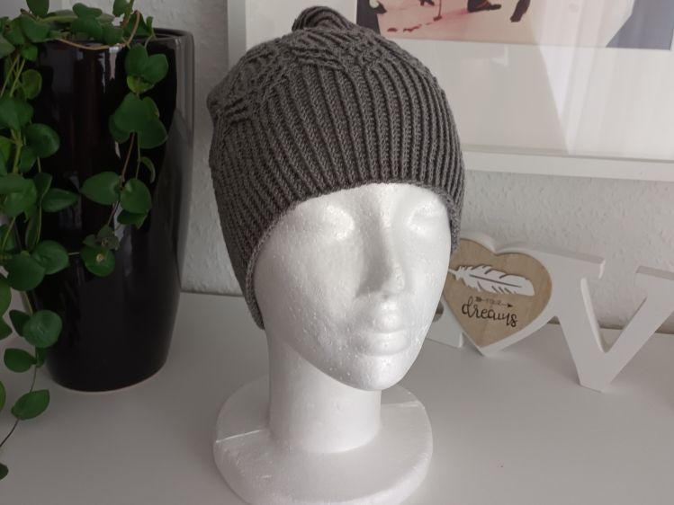 Es wird in Runden gestrickt und der schöne, breite Rauten Zopf ist ein absoluter Hinkucker und das Highlight der ansonsten schlichten Mütze. Natürlich wiederholt sich der Musterstreifen auch auf den Stulpen.