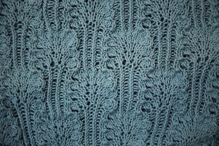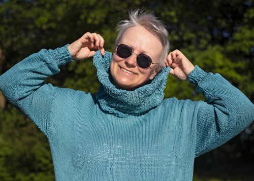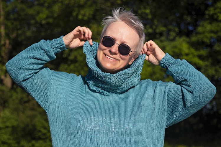 Der Sweater wurde nach dem Muster benannt, in dem die Bündchen und der Schalkragen gestrickt werden. Das „Heiße Quellen“-Muster sieht kompliziert aus – kann aber, wenn man über ein wenig Erfahrung beim Stricken von Mustern verfügt, leicht nachgestrickt werden. Alle dafür nötigen Stiche, die über die Grundlagen hinaus gehen, werden in dieser Anleitung ausführlich in Wort und Bild erklärt.