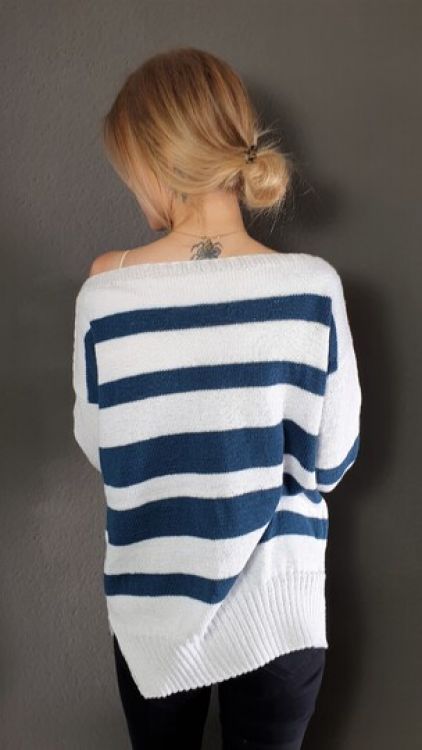 Der Pullover hat Seitenschlitze. Das Hinterteil ist länger, als das Vorderteil.