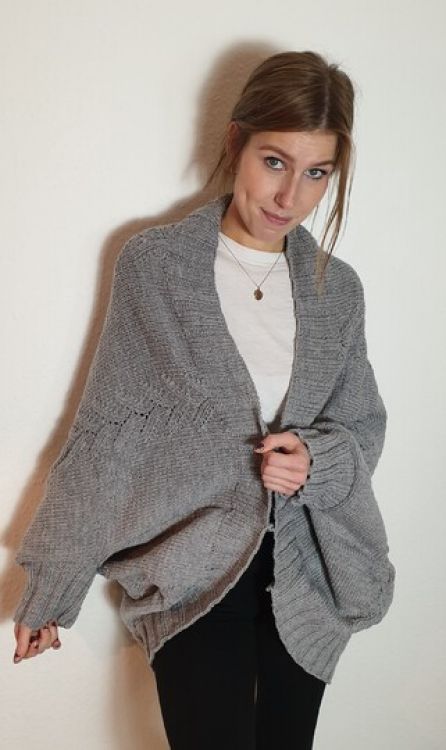 Das Model hat Größe 36/38 und trägt auf den Bild die große Version 44/48.