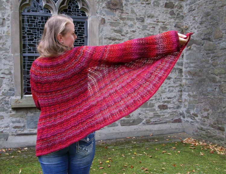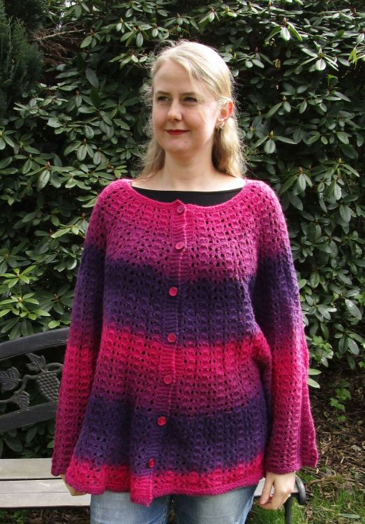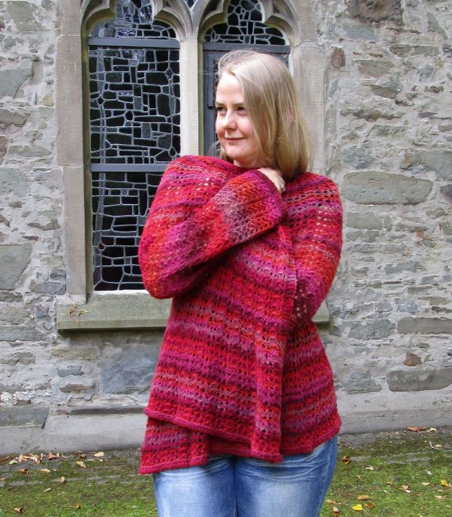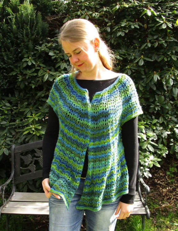 Columbine ist eine Anleitung für eine Lochmuster Weste oder Jacke und enthält genaue Angaben für 5 verschiedene Doppelgrößen und zwei verschiedene Garnstärken
