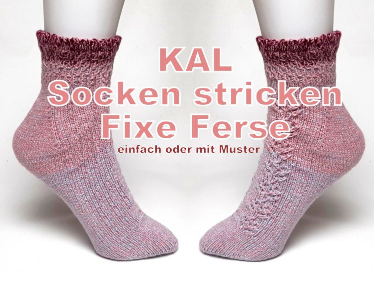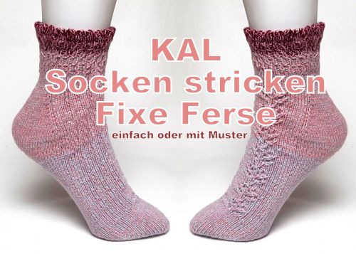 Wir stricken zusammen (KAL= knit along, gemeinsam stricken) die Toe-Up (von unten nach oben) Socken mit der Fixen Ferse. Sie kann wahlweise mit oder ohne Muster gestrickt werden, also für Anfänger wie für Sockenkenner geeignet. Sie wird in einem durch in Runden gestrickt.