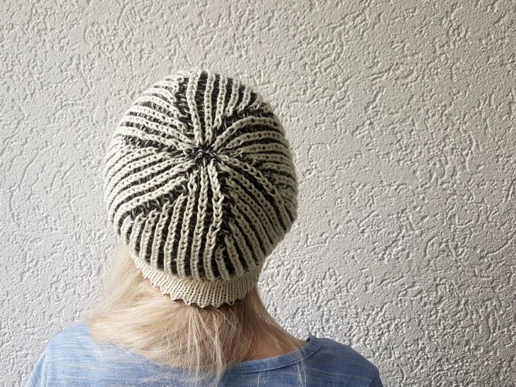 Material: 50g /LL 120m helle Farbe 50g/LL 100m dunkle Farbe Jeweils für die Nadelstärke 3,5-4 mm 1 Rundstricknadel, Stärke 4mm und 4,5mm, 40 oder 60 cm lang. Eventl. 1 Nadelspiel