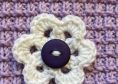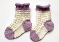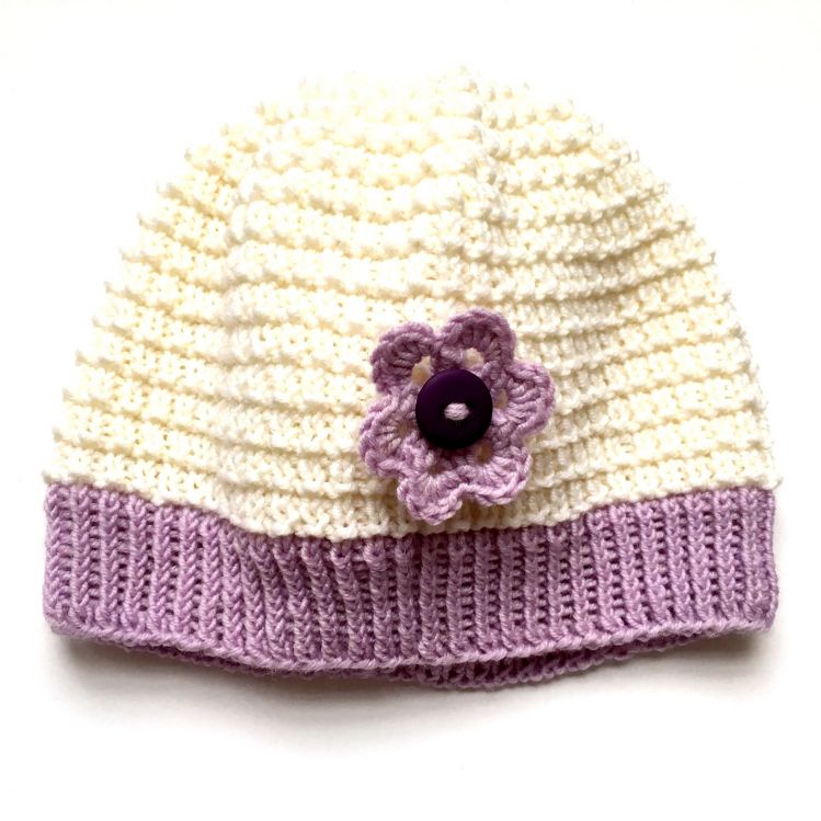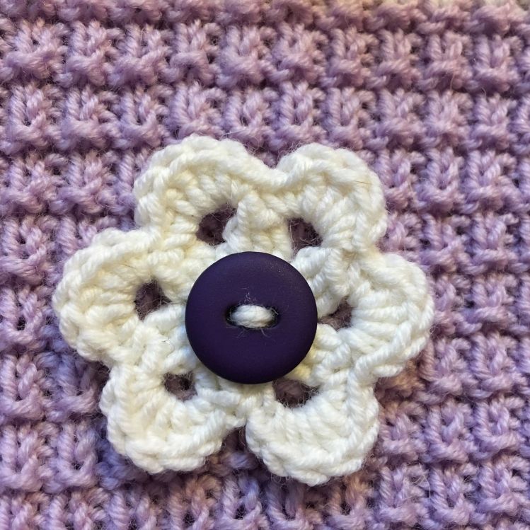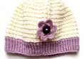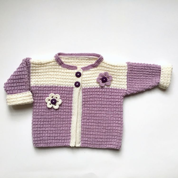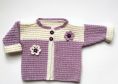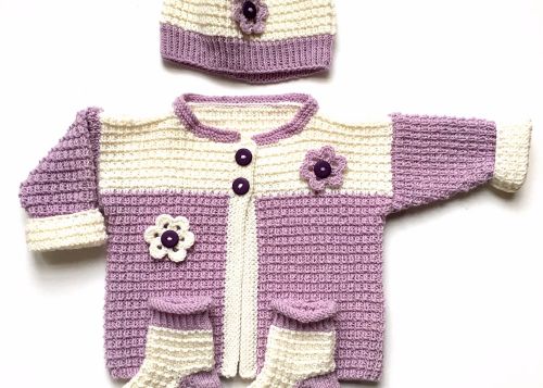 Babyset in lila mit weiß bestehend aus Jacke mit passender Mütze und Socken. Als Dekoration sind Häkelblüten aufgenäht.