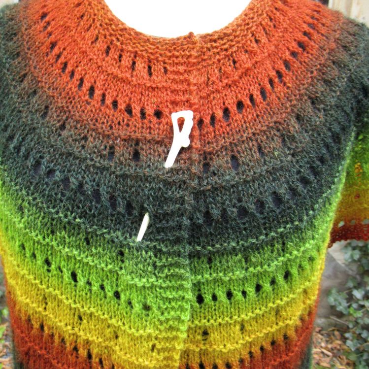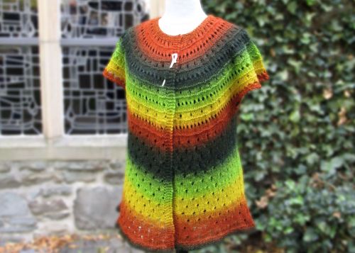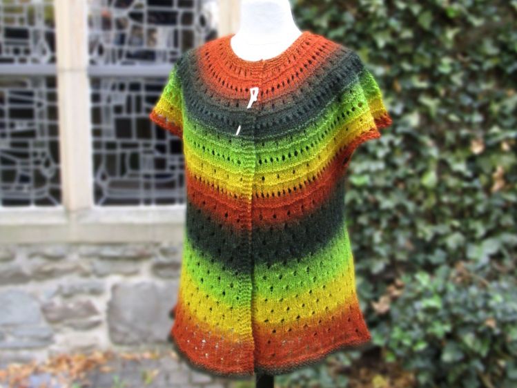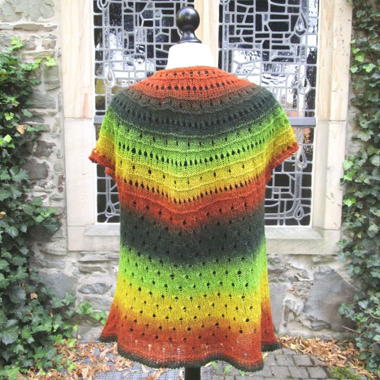 Crepidula ist besonders geeignet für Farbverlaufsgarne, denn man kann mit einem Faden von oben nach unten “durchstricken” und außerdem so lange stricken, bis die Wolle zu Ende ist, oder man die gewünschte Länge erreicht hat. Den unteren Rand kann man auch mit einer farblich passenden Wolle stricken.