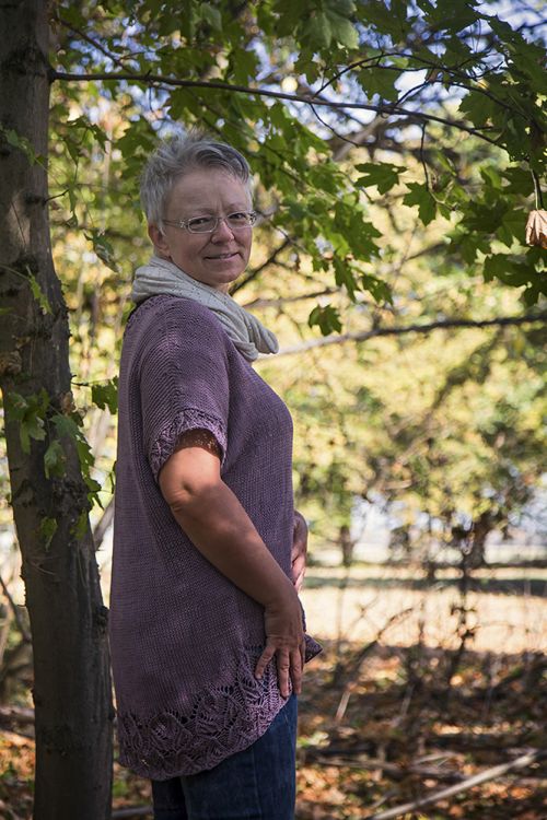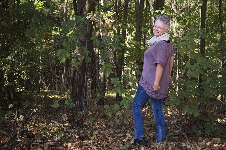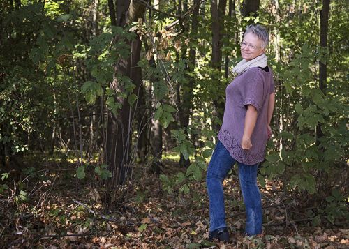 Die Kaleidoskop Tunika ist ein legeres Top, dass zu so ziemlich jeden Anlass passt. Sie kann als kurzärmeliges Sweatshirt getragen werden – sieht aber auch als eine Art Pullunder über einem langärmeligen T-Shirt gut aus. Der Blickfang ist eine breite Borte im Kaleidoskop Muster, die den unteren Saum bildet. Die Linie des Saums ist unsymmetrisch: Das Rückenteil ist länger als das Vorderteil. Diese Form erhält die Tunika durch den Einsatz von verkürzten Reihen . Diese Technik wird ebenfalls für die Schulterschrägung und den Halsausschnitt verwendet.