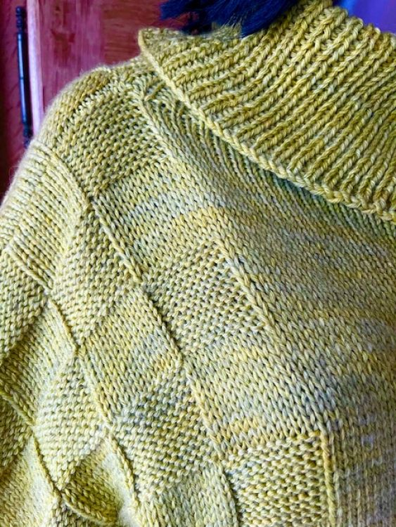 Es wird in 2 Teilen gestrickt und zum Schluß wird noch ein Halbkragen daran gestrickt.