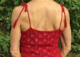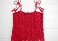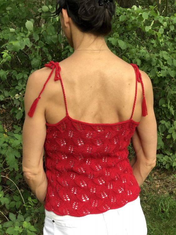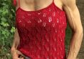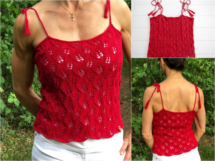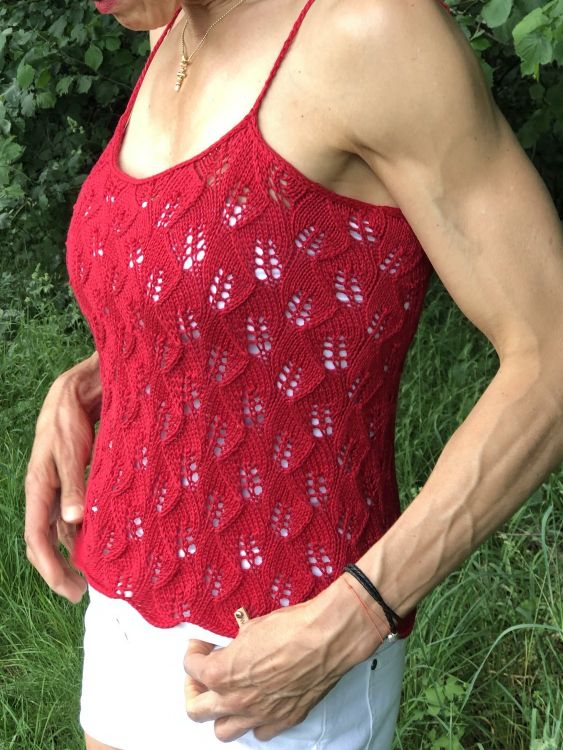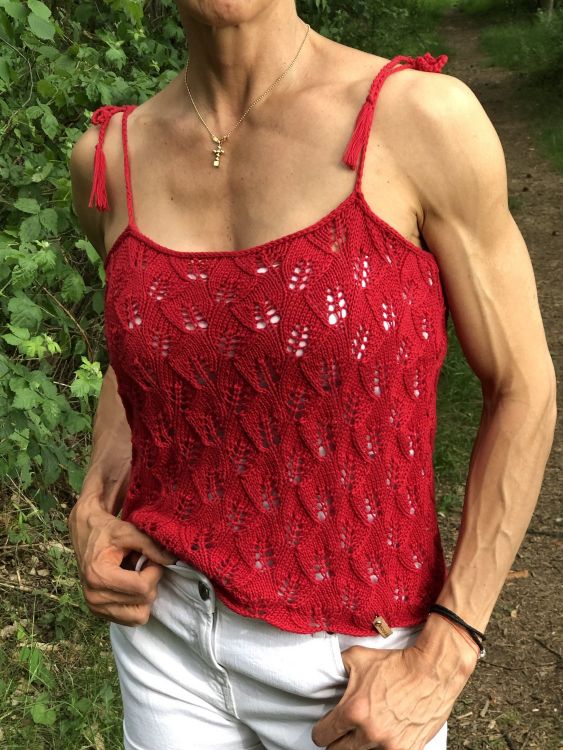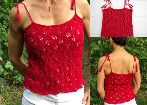 Kurz geschnittenes Trägertop mit bezauberndem Blättermuster. Das Besondere an diesem Top ist, dass es in einem Stück gestrickt wird.