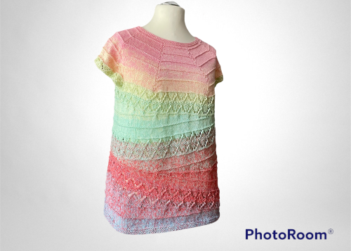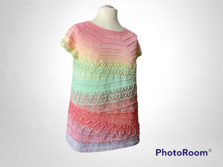 Diese Tunika ist mal was ganz anderes. Eigentlich in Runden gestrickt, aber unterbrochen mit verkürzten Reihen, lässt dein beues Shirt den Farbverlauf einmal ganz anders wirken. Probier es aus.