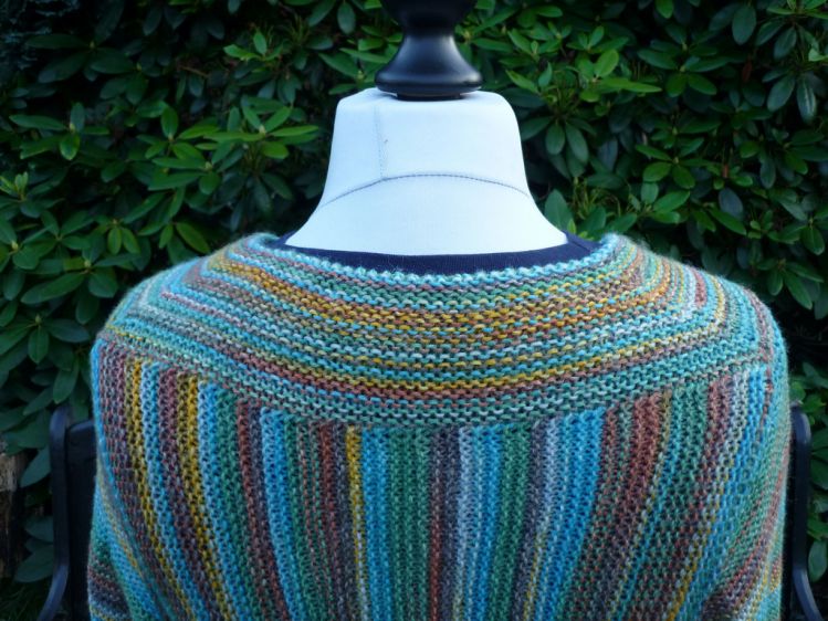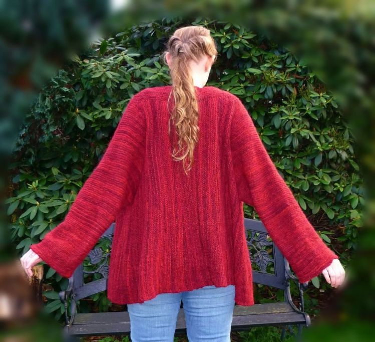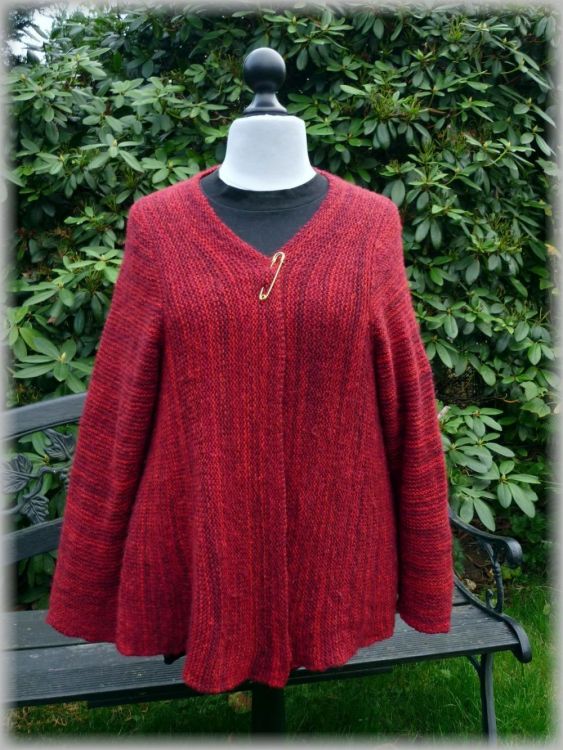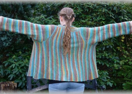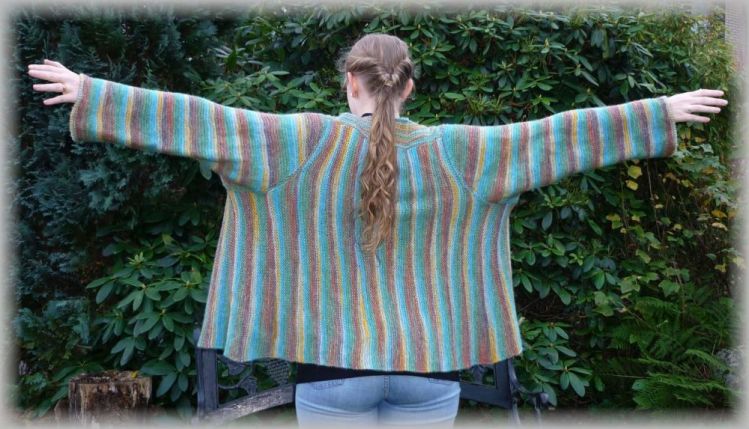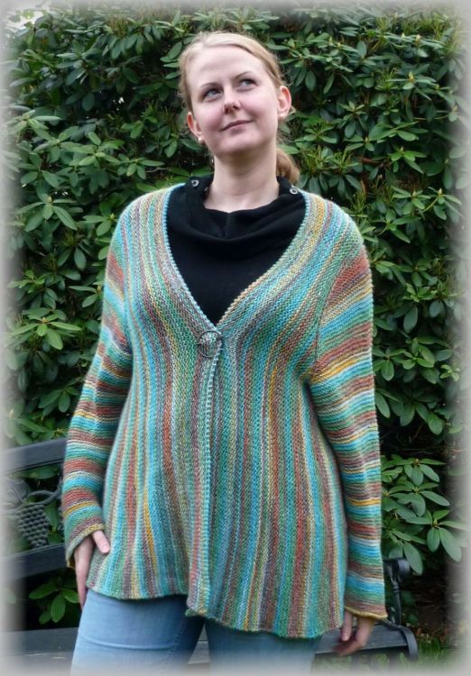 Die Anmore Jacke wird seitwärts von einer Seite zur anderen gestrickt, und zwar in einem Stück ohne den Faden neu anzusetzen. Die Form sieht auch bei „Moppelchen“ gut aus (ich bin selber eins).