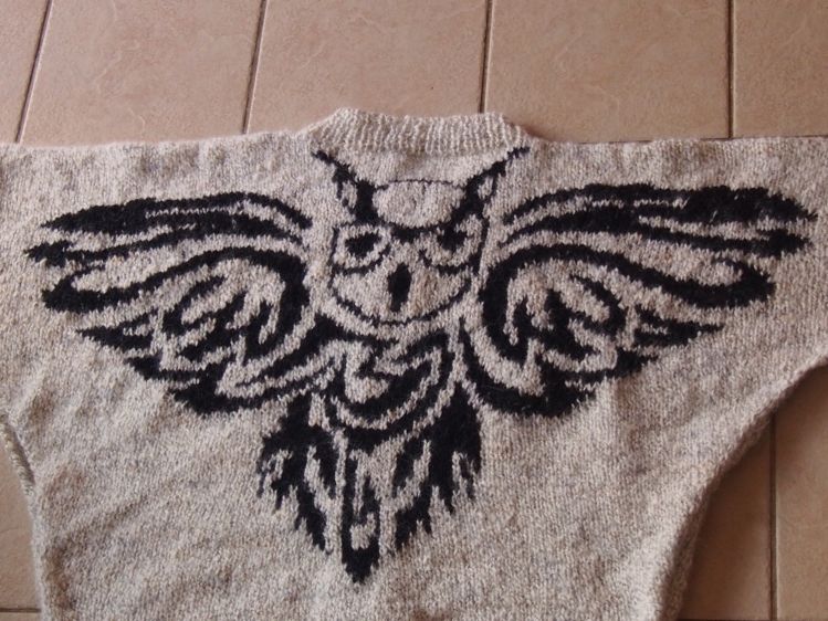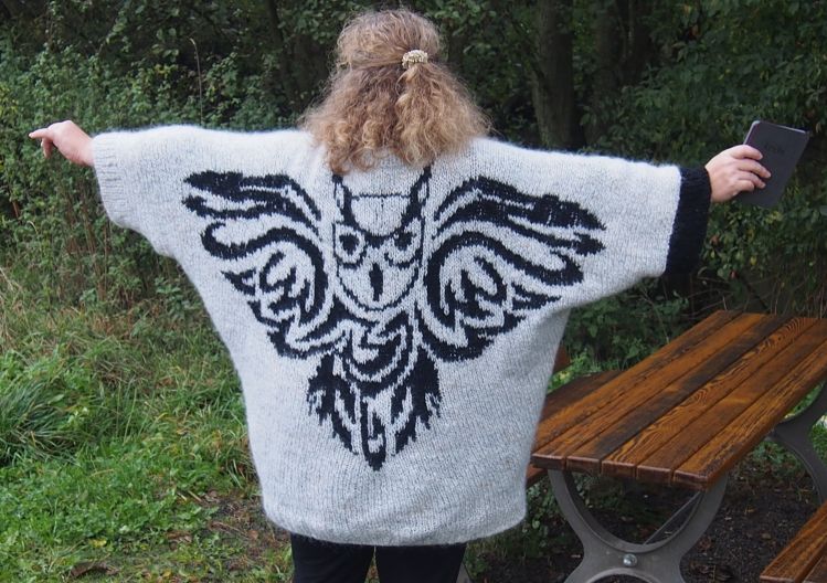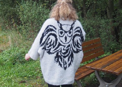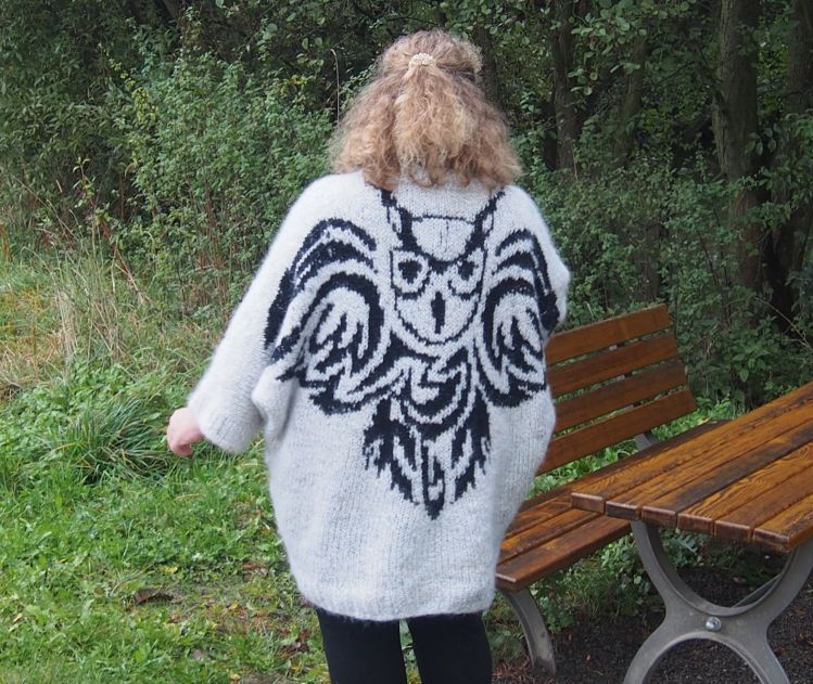 Die Eule - hier mal ausgehfein auf einer warmen Jacke, die an Schnee im Winterwald erinnert. Die Eule ist in Norweger-Technik nach einer Zähl-Vorlage eingestrickt, kann aber auch (einfacher) auf die fertige Jacke mit Hilfe eines Maschenstiches aufgestickt werden.