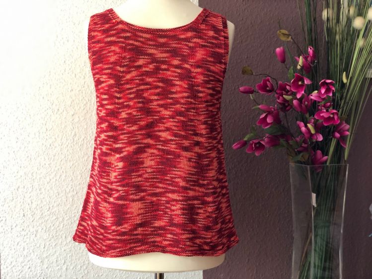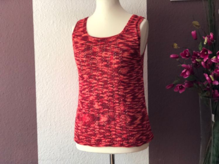 Das Top wird in zwei Teilen von unten nach oben gestrickt. Auf dem Vorderteil wird mit Ajour-Muster gearbeitet, das Rückenteil ist glatt rechts gestrickt.