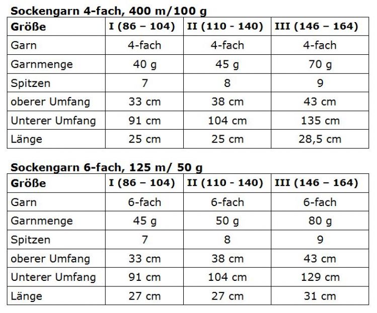 Material: 40 bis 80 g Sockenwolle (jeweils für 4-fach und 6-fach Sockenwolle)