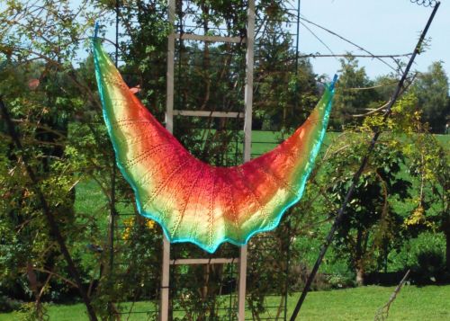 Die Namensgeberin für dieses Tuch ist meine 4-jährige Enkeltochter, die meinte, das sieht wie eine Fledermaus aus. Und da ich dieses für sie gestrickt habe, wurde daraus das Fledermäuschen.