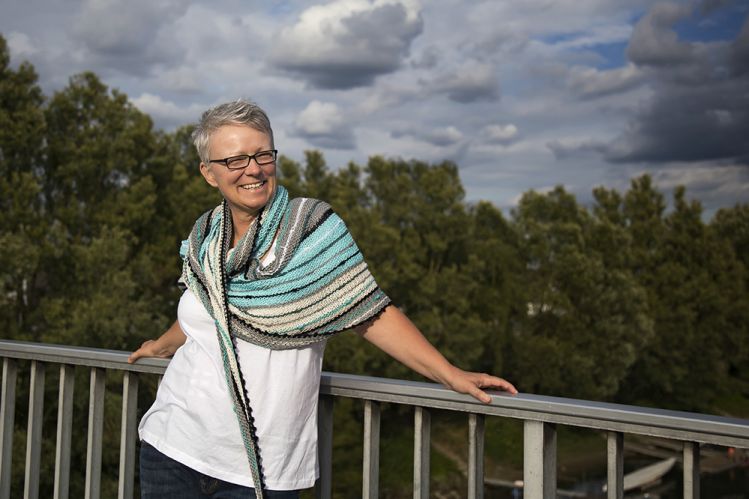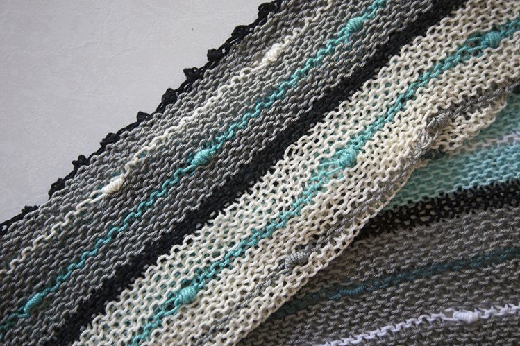 Das Knubbelchen-Tuch ist ein tolles Projekt, um Garnreste zu verarbeiten und nebenbei noch eine neue Technik auszuprobieren. Es besteht aus breiten Streifen, die durch schmale Streifen mit nur wenigen Reihen durchbrochen werden – so dass Sie auch ganz kleine Garnreste in diesem Tuch Verwendung finden können. Als Tüpfelchen auf dem i enthalten diese schmalen Streifen kleine Knubbelchen, die auf der rechten Seite des Tuches zu sehen sind.