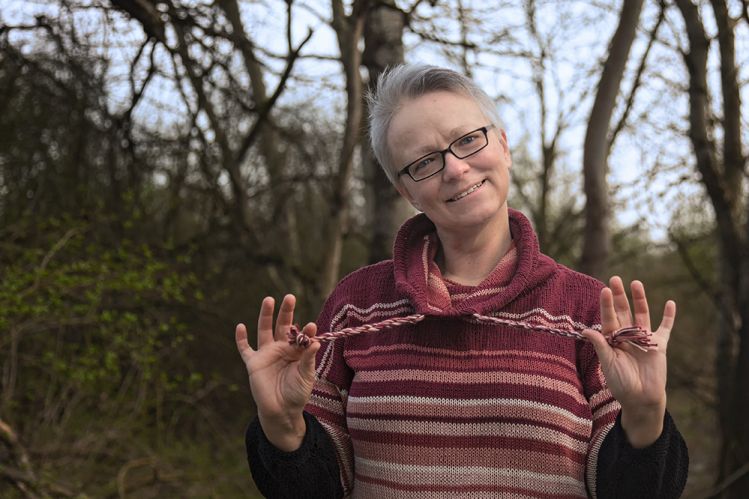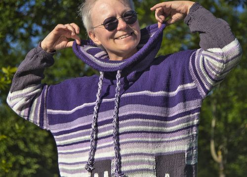 Der Sweater ist weit geschnitten und fällt fast wie eine Tunika. Die Ärmel werden gerade angesetzt - und wenn man die Arme hängen lässt, führen die Streifen im Ärmel die Streifen auf Vorder- und Rückenteil weiter. Der Kragen besteht aus einem weiten Schalkragen, durch den eine selbstgedrehte Schnur in den Farben des Sweaters gezogen wird.