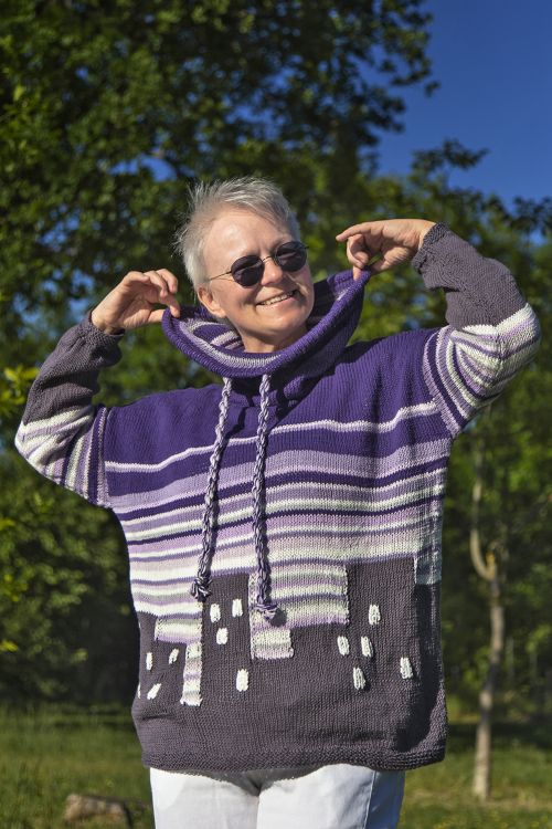 In der Anleitungsreihe "Lichter der Stadt" habe ich versucht, meine Impressionen der Frankfurter Skyline festzuhalten. Der Sweater zeigt auf der Vorderseite die Silhouette einer Stadt vor drei verschiedenen Farbvarianten: