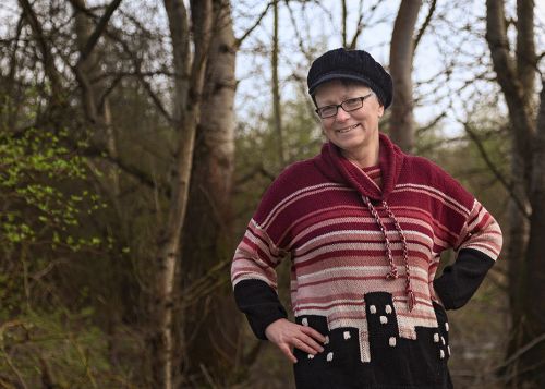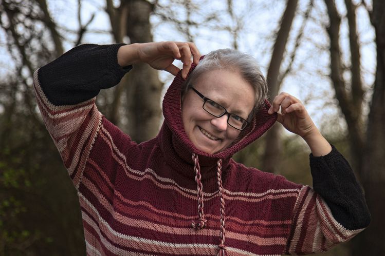 Der Sweater ist weit geschnitten und fällt fast wie eine Tunika. Die Ärmel werden gerade angesetzt - und wenn man die Arme hängen lässt, führen die Streifen im Ärmel die Streifen auf Vorder- und Rückenteil weiter. Der Kragen besteht aus einem weiten Schalkragen, durch den eine selbstgedrehte Schnur in den Farben des Sweaters gezogen wird. Die Anleitung enthält Angaben für die Größen M / L / XL. Sie kann jedoch leicht für weitere, größere Größen angepasst werden.