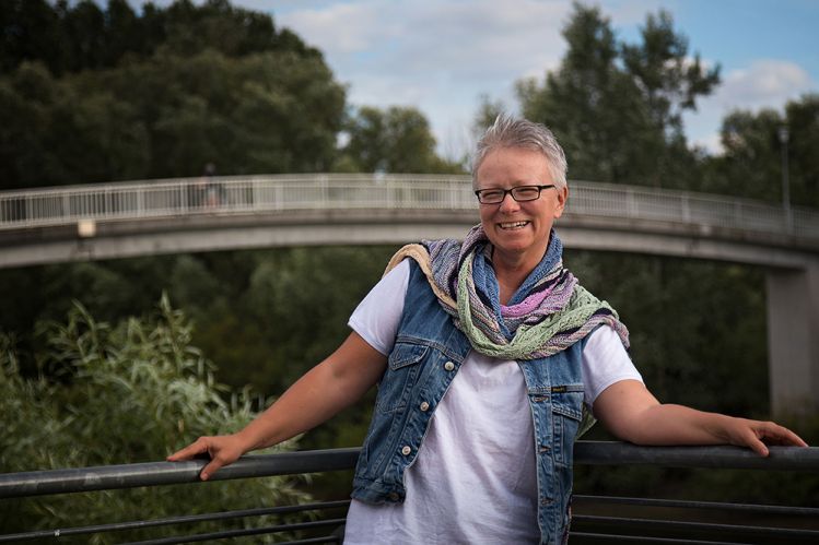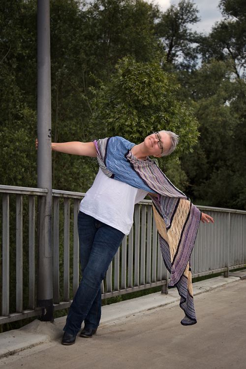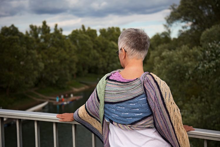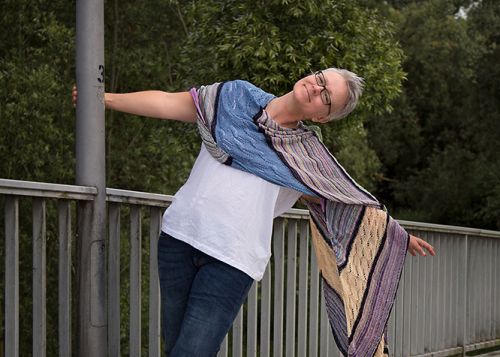 Das „Alle meine Farben“-Tuch besteht aus Muster- und Farbmix-Streifen, die sich abwechseln. Die Muster-Streifen sind einfarbig – wogegen in dem Farbmix-Streifen 5 Farben gemischt werden. Trotzdem hat jeder der Farbmix-Streifen eine andere Farbwirkung. Die Muster-Streifen werden in unterschiedlichen Zopf-Lochmuster gestrickt. Das Stricken ist sehr abwechslungsreich, da Sie zwischen einem Farbrausch und immer neuen Herausforderungen beim Musterstricken hin und her wechseln. Was das Stricken noch interessanter macht, ist die sich ändernde Strickrichtung. Die Strickrichtung der Muster-Streifen ist um 90 ᴼ zu der Strickrichtung der Farbmix-Streifen gedreht. Keine Angst: das Tuch wird in einem Stück gestrickt! Sie müssen die einzelnen Streifen nicht zusammen nähen!